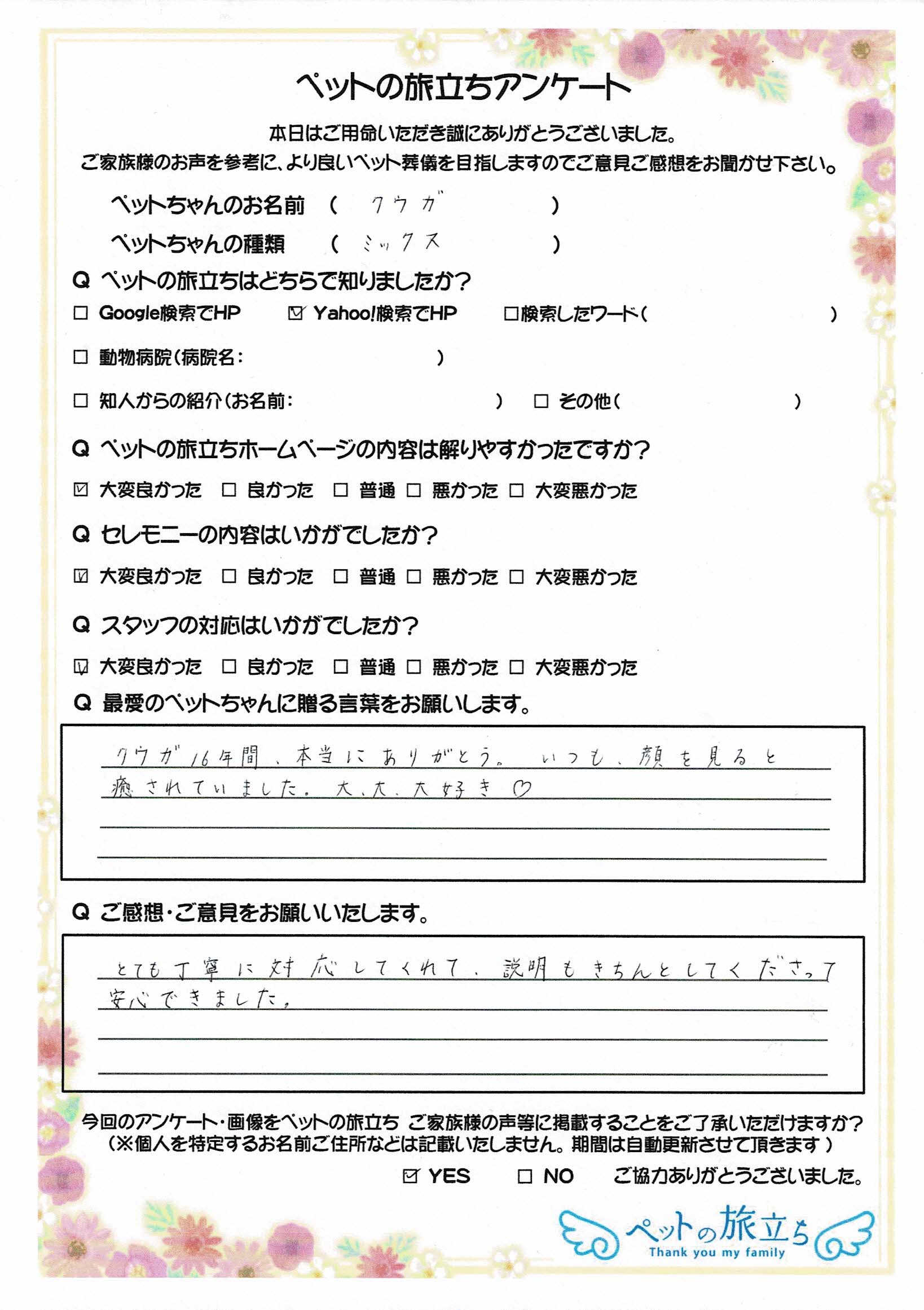 香川県 仲多度郡 T様 | クウガちゃん 2019/11/23 旅立ちプラン クウガちゃん 犬 MIX 享年16歳 男の子 【クウガちゃんへ】 クウガ 16年間、本当にありがとう。 いつも、顔を見ると 癒されていました。 大 大 大好き ♡ 【ペットの旅立ちへのお言葉】 とても丁寧に対応してくれて、説明も きちんとして下さって 安心できました。 クウガちゃんのご冥福を心よりお祈り申し上げます。 ペット火葬 葬儀「ペットの旅立ち 香川」 セレモニースタッフ担当 藤井